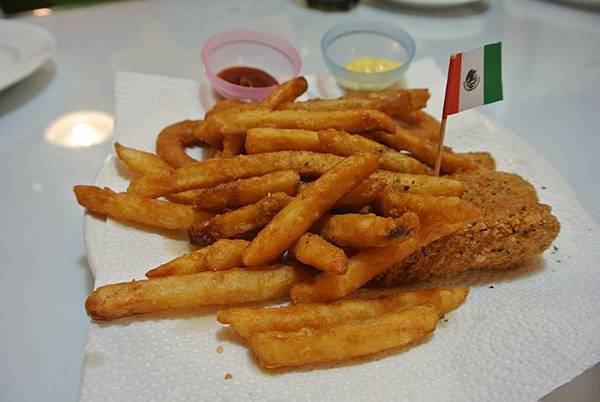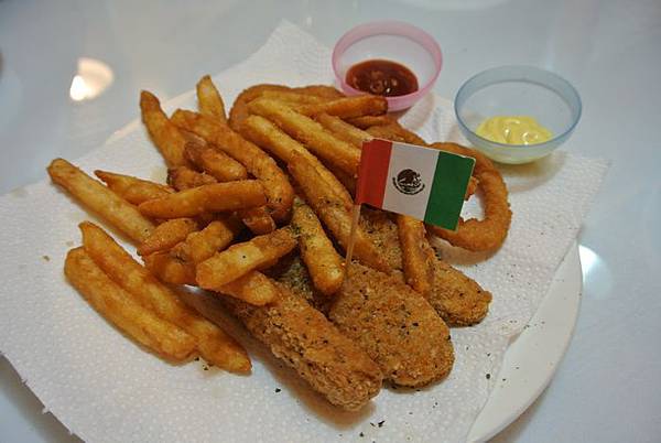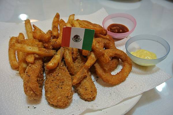 小拼盤$109,有薯條、洋蔥圈、檸檬雞柳條