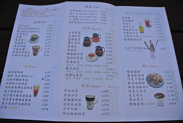 飲品部份有咖啡、啤酒、調酒花茶、奶茶、醋飲及冰茶還有點心部份