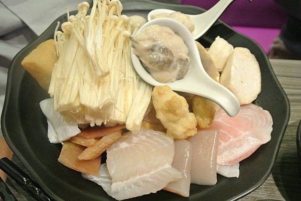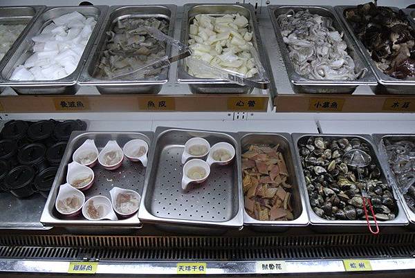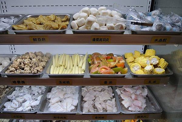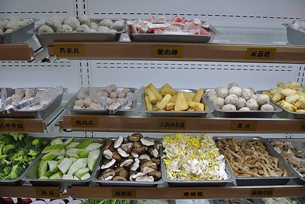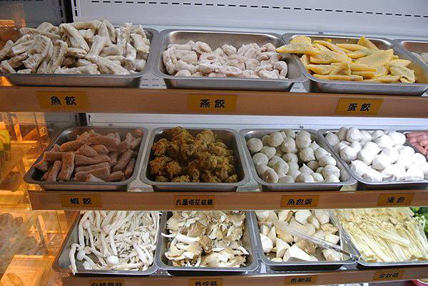 魚餃、燕餃、蛋餃、蝦餃、九層塔花枝燒、魚蛋、湯包、白靈菇、秀珍菇、杏鮑菇、金針菇
