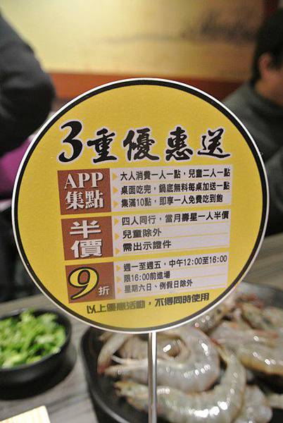 APP集點:大人消費一人一點、兒童二人一點;桌面吃完,鍋底無料每桌加送一點;集滿10點即享一人免費吃到飽