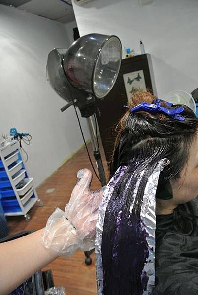 整頭都上完染劑後,再用烘罩烘約10多分鐘
