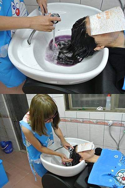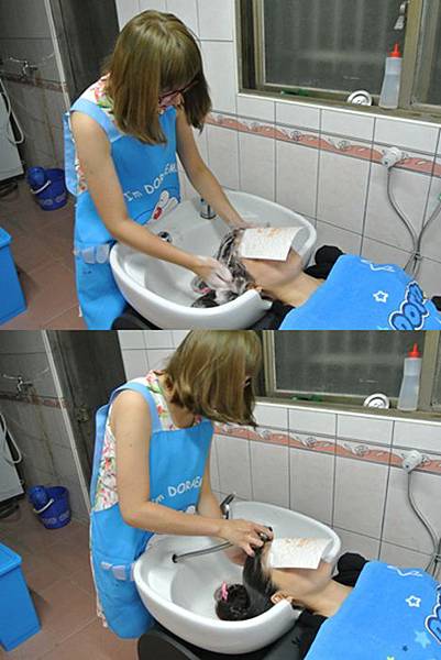 沖洗乾淨後,繼續回到座位上進行護髮的動作