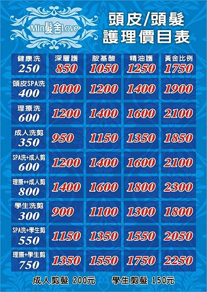 成人剪髮200元/學生 150元/頭皮隔離加 200元