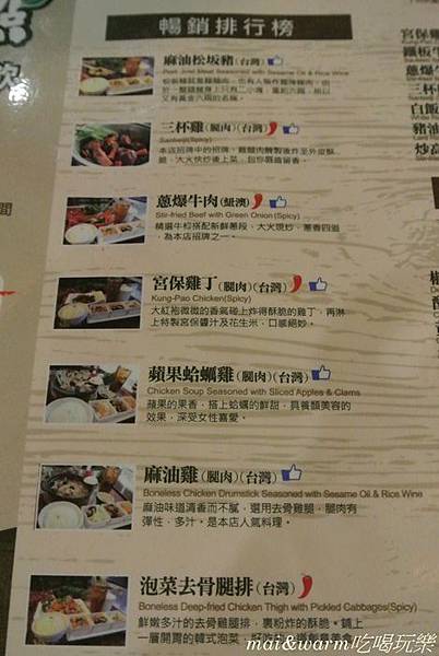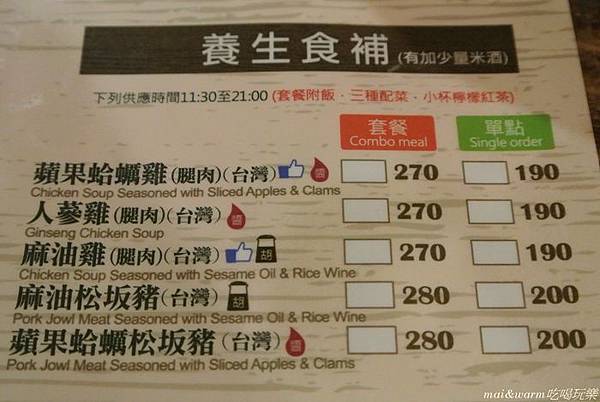 餐點部份有熱炒套餐、中式套餐、養生食補及鴛鴦火鍋的選項
