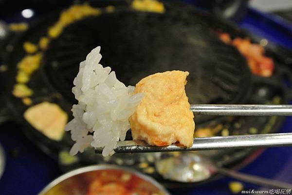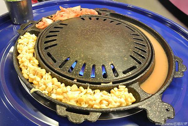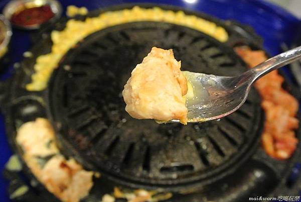 烤爐上有韓式泡菜、玉米起司及韓式烘蛋