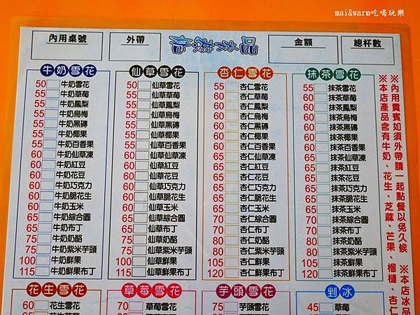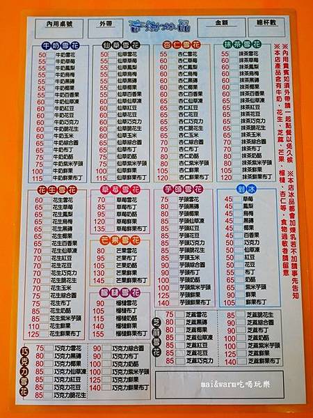 奇淋冰品的menu好大一張,密密麻麻的雪花冰種類看的眼花潦亂