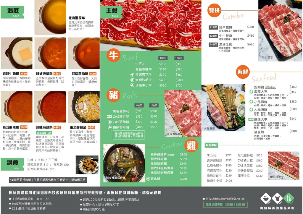 每份鍋物皆含有菜盤、副食(白飯/冬粉/王子麵/讚歧烏龍麵+10元/蒸煮麵+10元/超有肉丼飯+10元擇一)