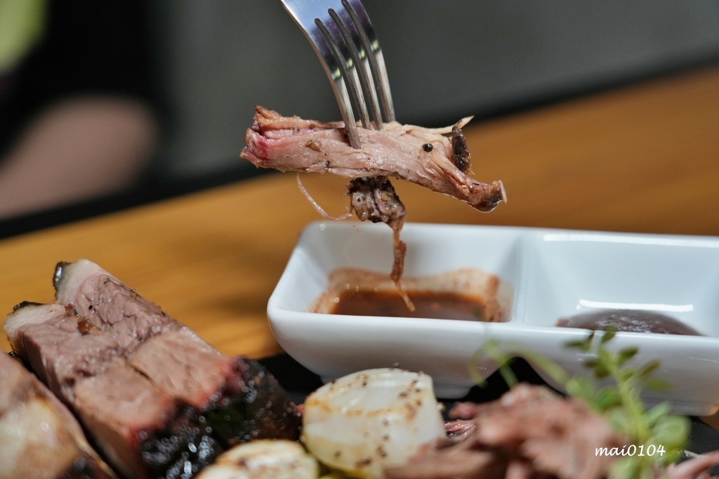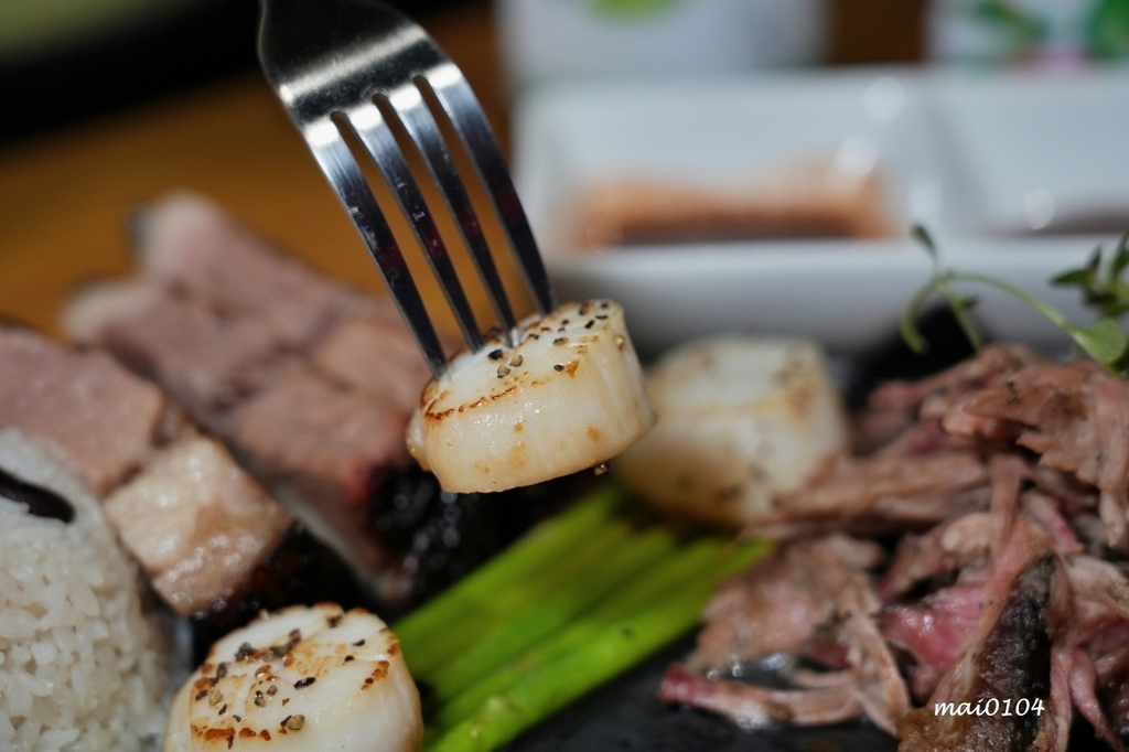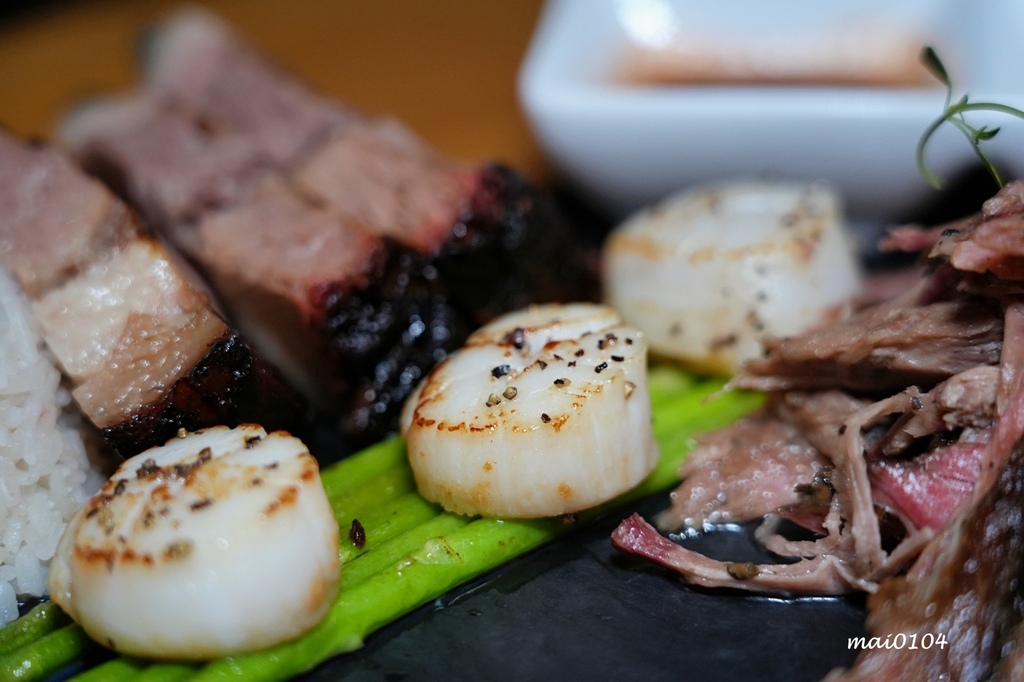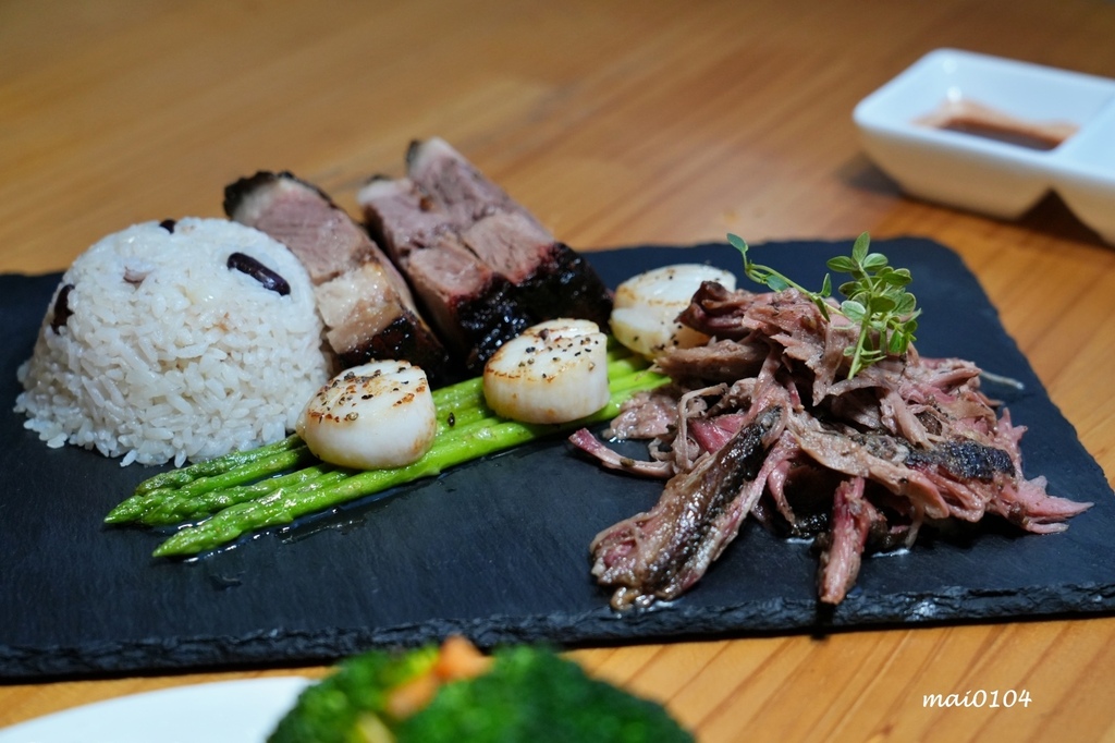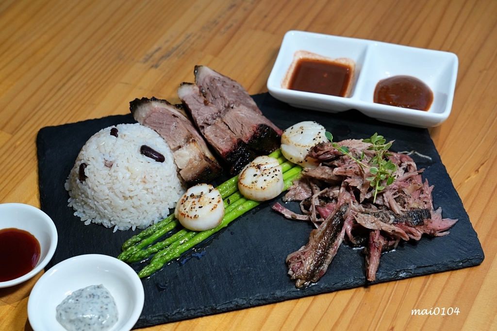 雙肉餐有牛前胸、手撕豬、干貝佐奶油蘆筍、手抓飯,也有各自搭配的醬料