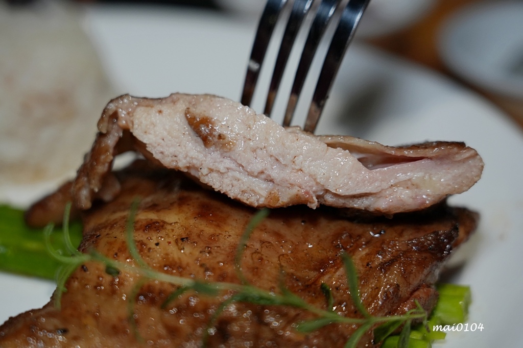 使用台灣在地去骨雞腿,加上主廚獨家配方醃製12~18小時,再用龍眼木低溫烤製2~3小時