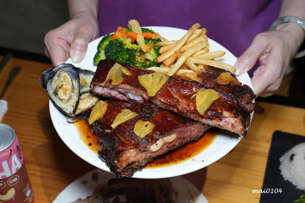 有著三大塊的豬腩排、白酒奶油淡菜、烤西蘭花及手抓飯
