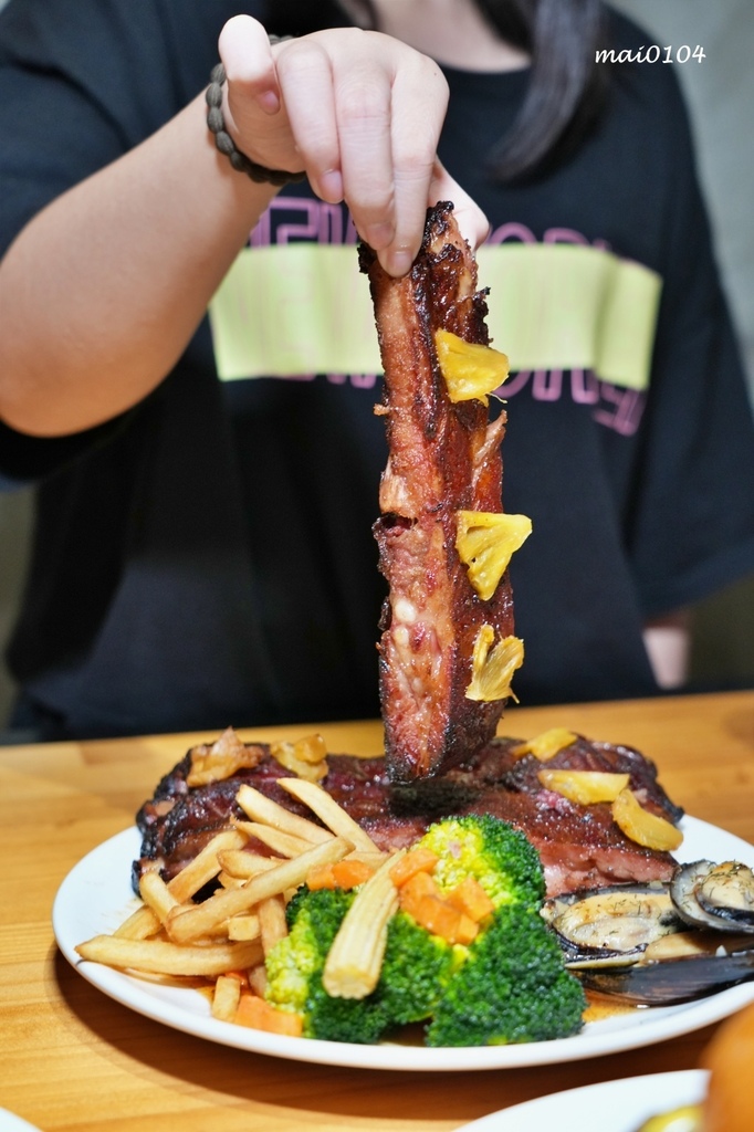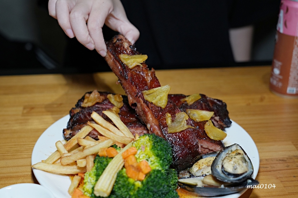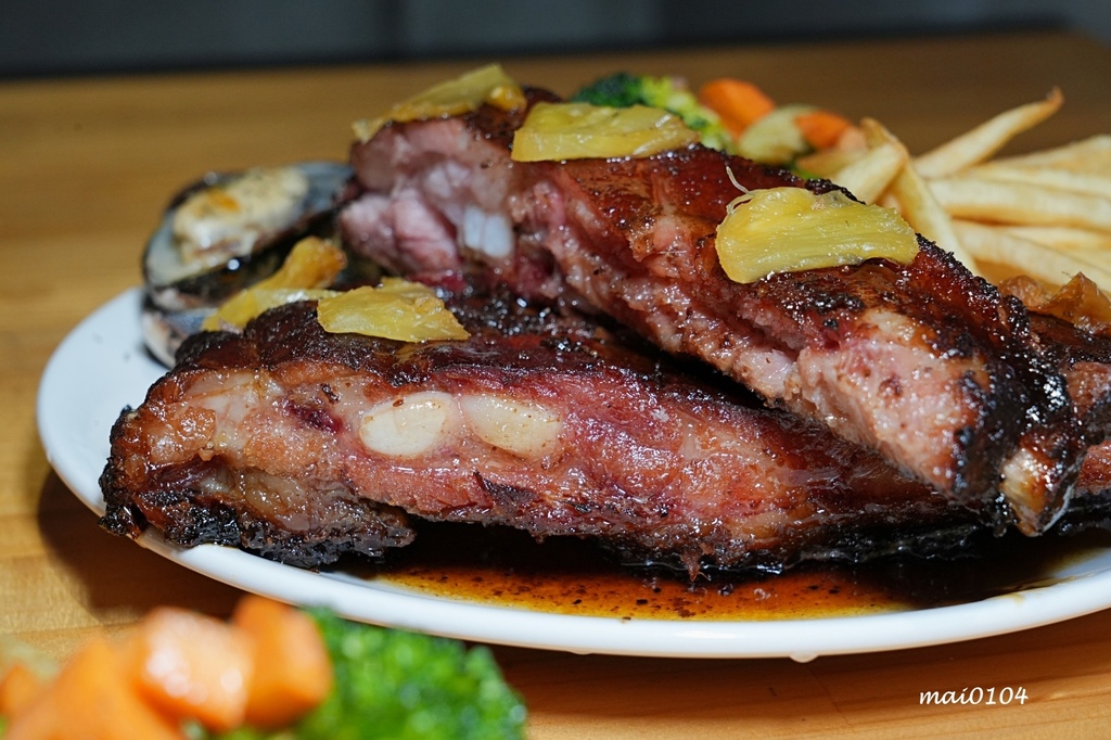 一般看到的是豬肋排,橙子美式炭烤餐廳使用的是比肋排有著更多的肉與油花的豬腩排