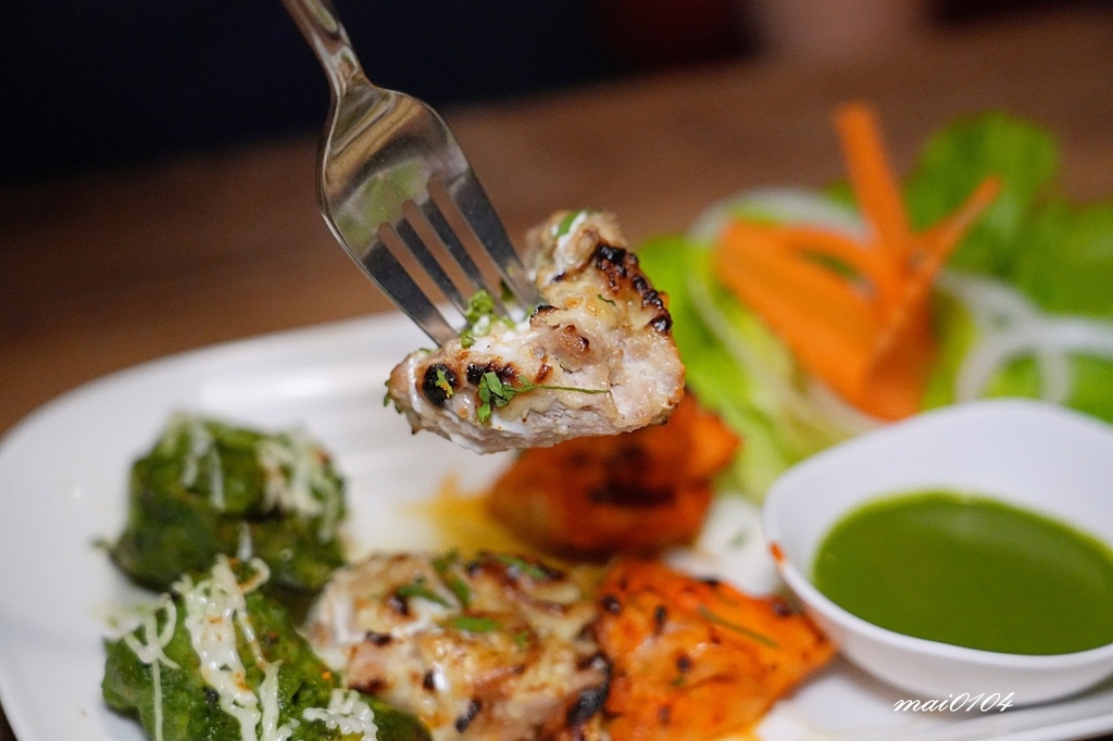 薄菏香料碳烤雞是鮮甜的雞肉加上印度香料、薄荷醬調味,上層再擠上美奶滋