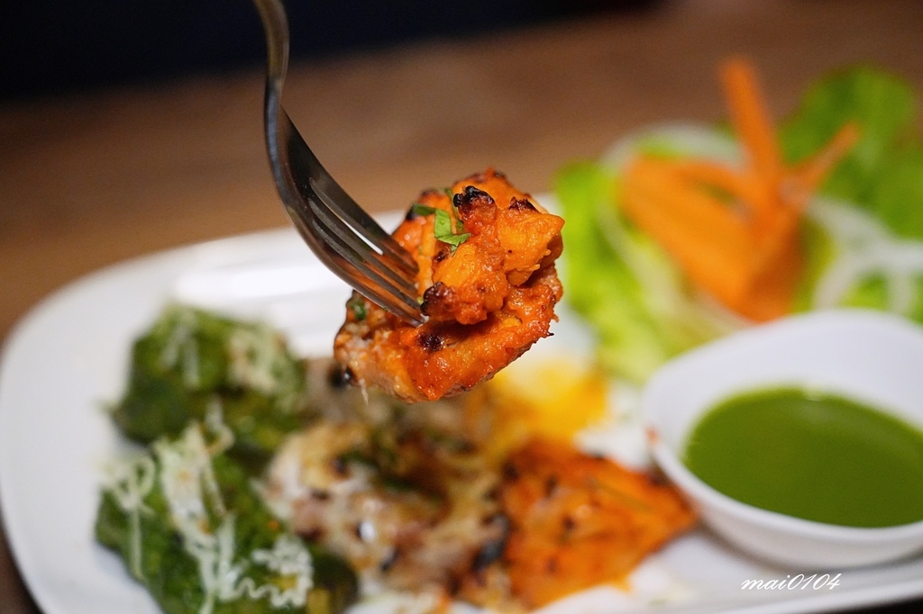 香辣碳烤香料雞使用印度香料調味的無骨雞腿肉,醃製後再做窯烤,散發出迷人的煙燻香氣