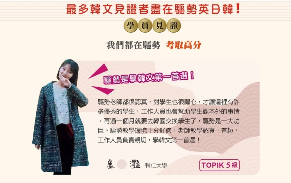 驅勢英日韓累積20多年補教業專業經驗,更是業界第一間韓文補習班