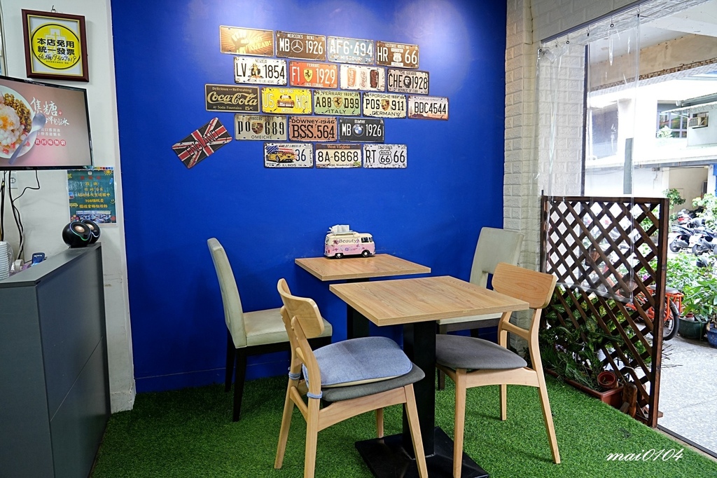 裡面的座位運用地中海藍白風情的照片及美式風格的鐵製車牌營造出不同的用餐氛圍