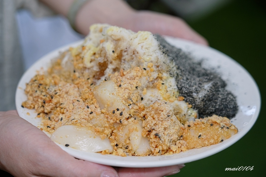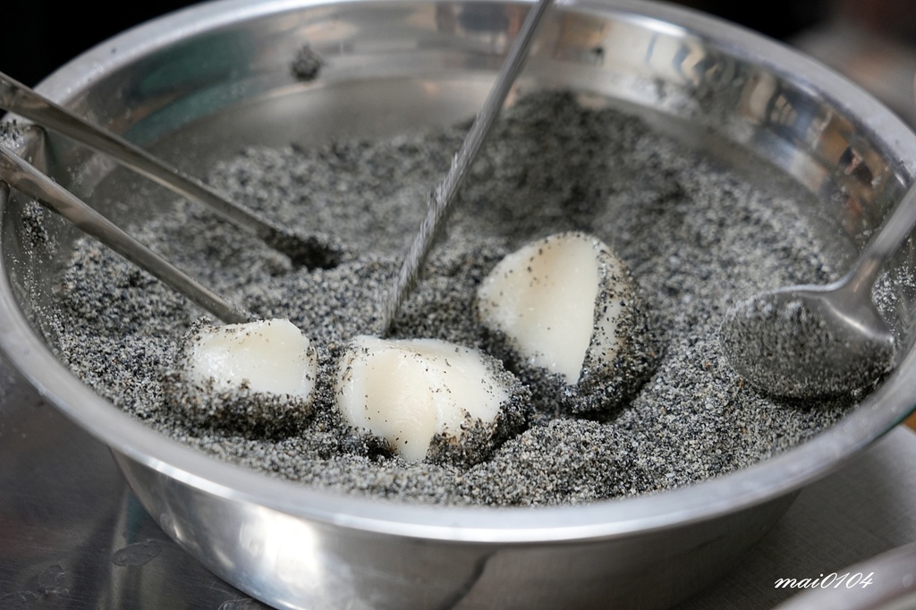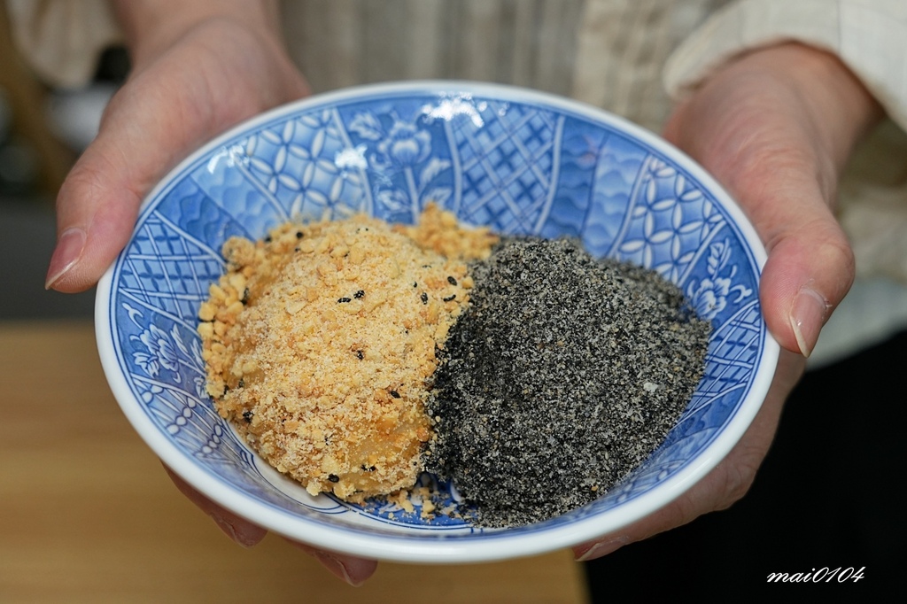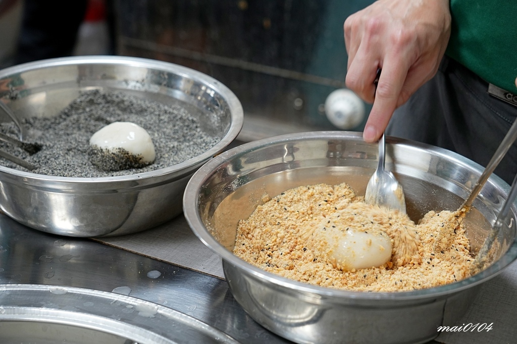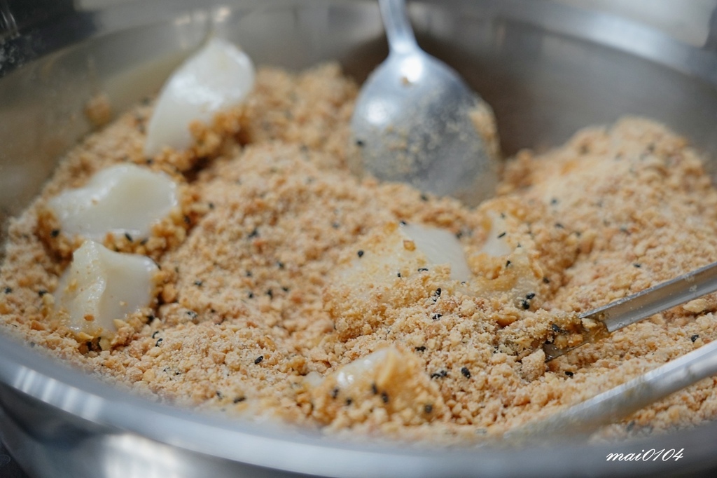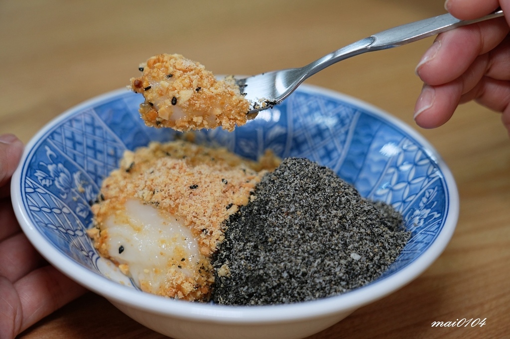 剛上桌的麻糬超級柔軟又保有Q度、帶點微熱感,不管是搭配花生粉或芝麻粉都相當可口