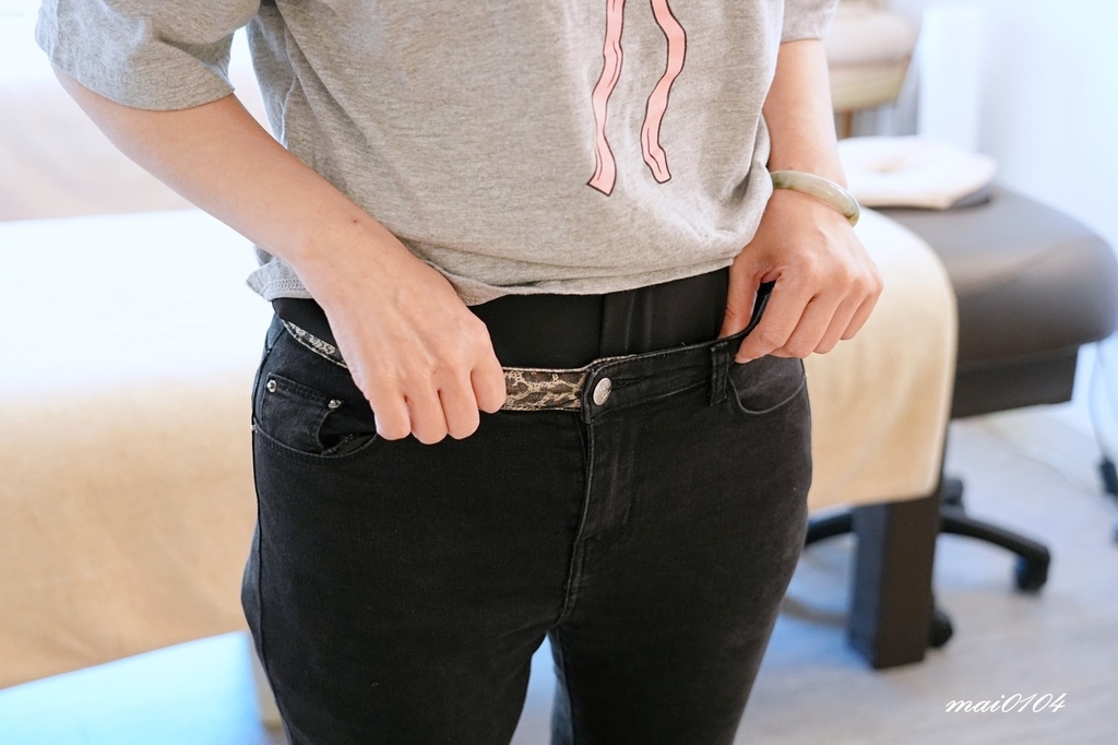 預約時,阿湯師特別交代大妹可以帶一條平常穿起來偏緊的褲子到現場試套,等骨盆調理後再試套一次,比較其差異性